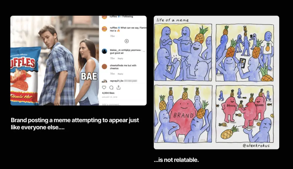 Don’t try to fake connection by being something you’re not as a brand. Large brands overestimated how cool they would come off when starting to spam posts on twitter. Now, you’ll see it happening with tons of backlash.
